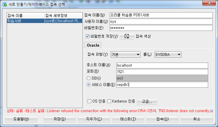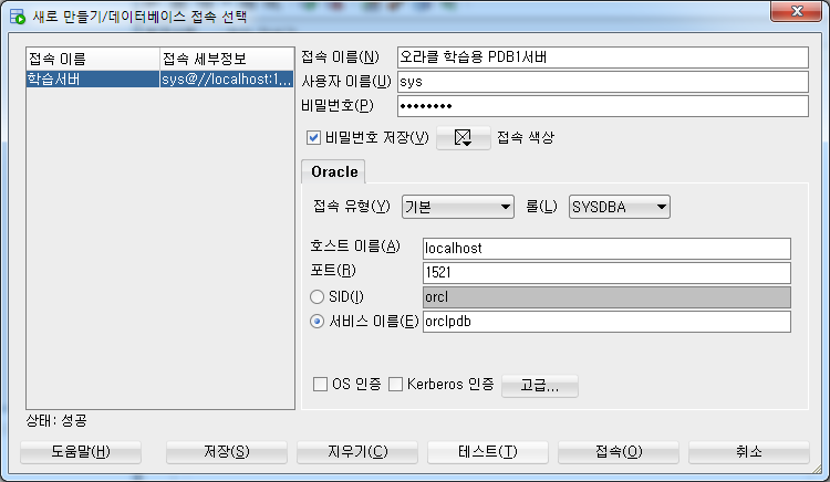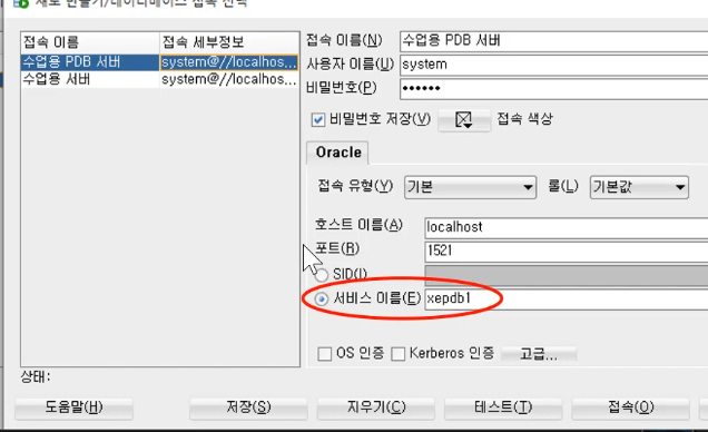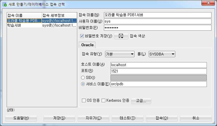 오라클 학습용 PDB1서버의 sys계정과