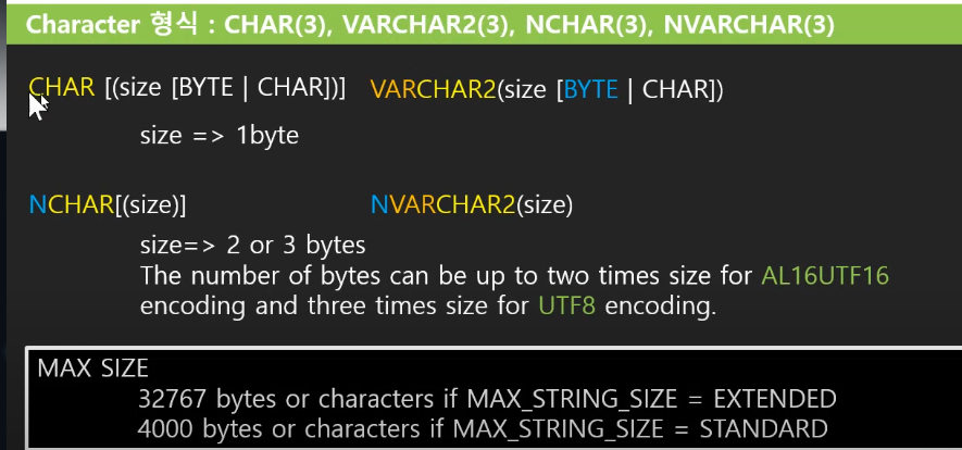 VARCHAR : 가변길이 (메모리 가변), 검색이 느림