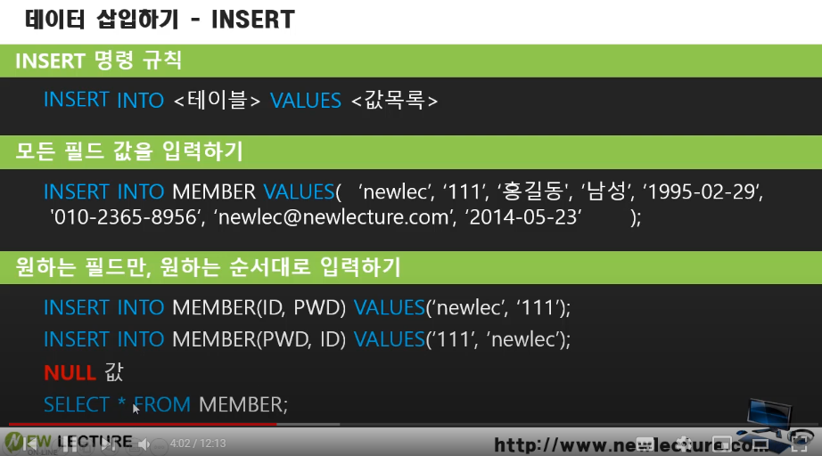 | 오라클 데이터베이스 SQL 강의 12강 - 데이터 조작하기 #2 (UPDATE/DELETE) (0) | 2022.01.06 |