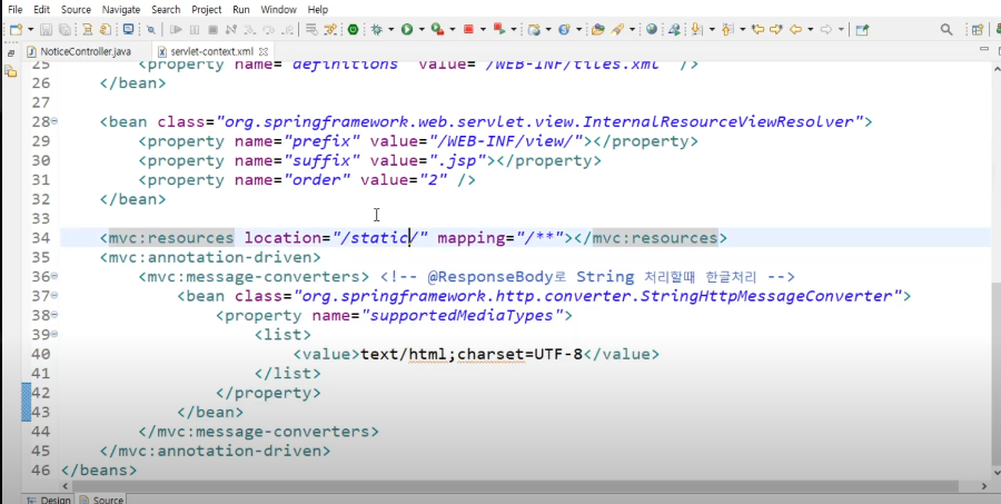 <mvc:message-converters> <!-- @ResponseBody로 String 처리할때 한글처리 -->