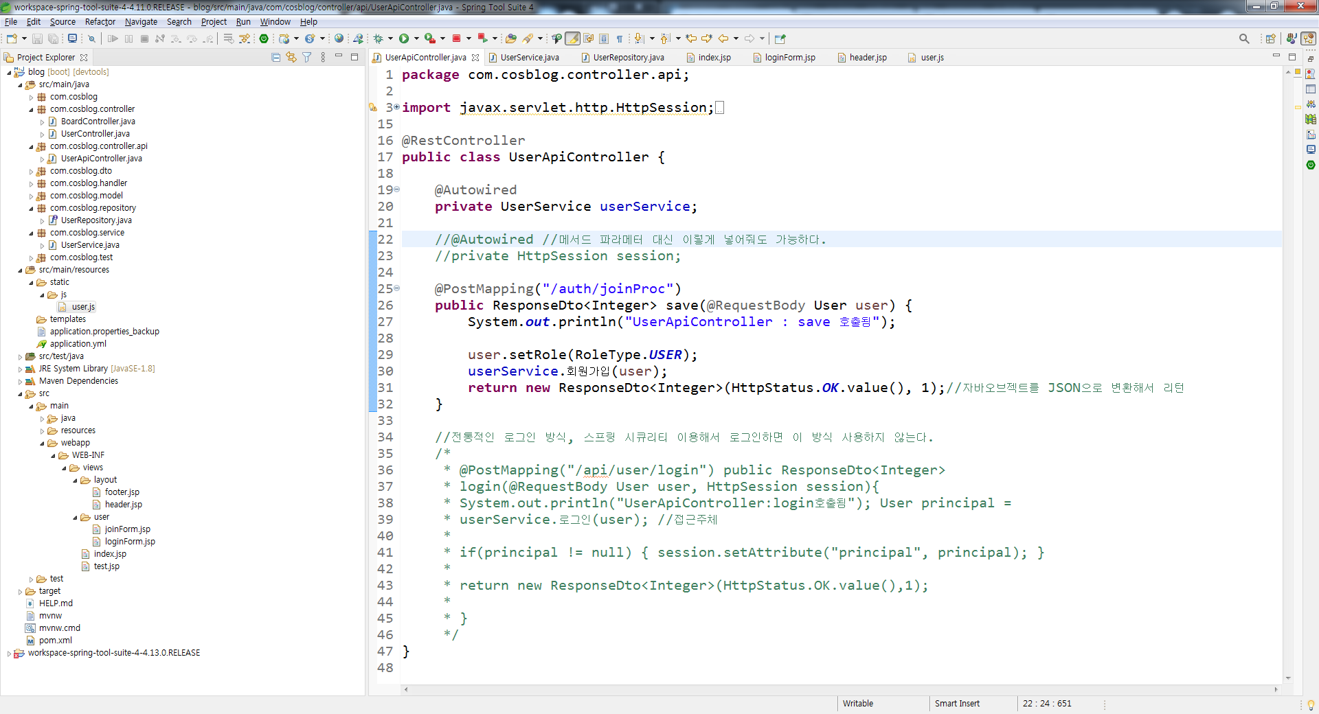 34행부터 해당하는 전통적인 로그인 방식 주석처리