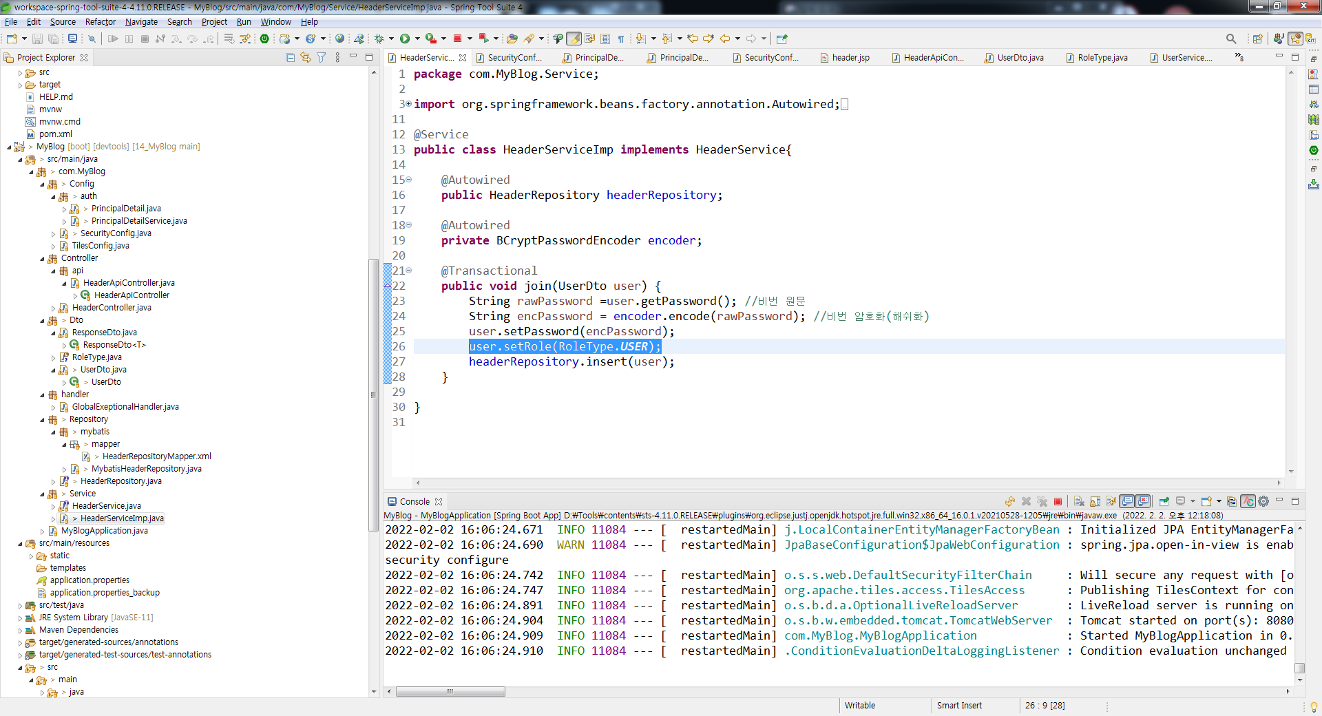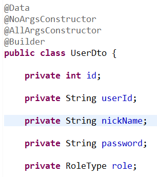 일단 26행과 같이 회원가입시 Role값 들어가게 설정했다.
