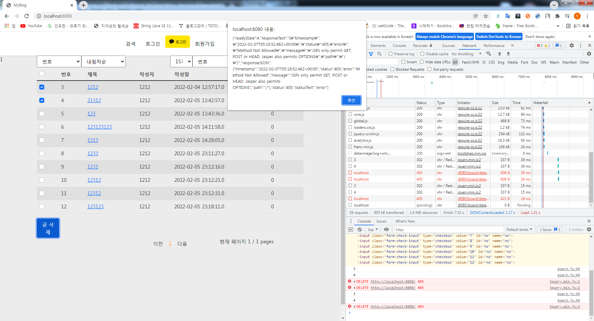 해당 경우는 로그인을 안한 상태로 글 삭제를 요청했더니 스프링 시큐리티에 의해 경로가 막혀서 뜨는 에러