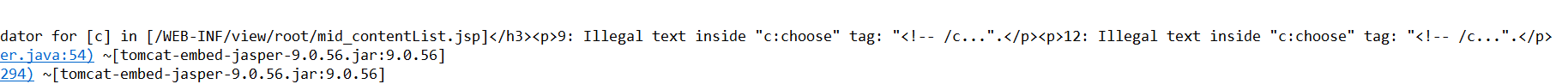 org.apache.jasper.JasperException: <h3>Validation error messages from TagLibraryValidator for [c] in [/WEB-INF/view/root/mid_contentList.jsp]</h3><p>9: Illegal text inside "c:choose" tag: "<!-- /c...".</p><p>12: Illegal text inside "c:choose" tag: "<!-- /c...".</p>