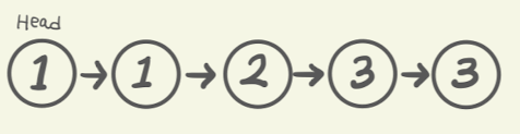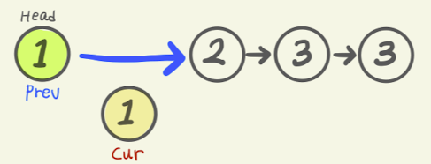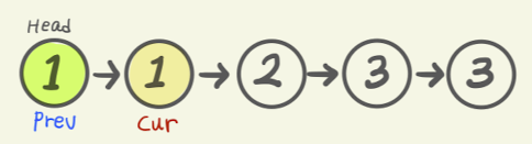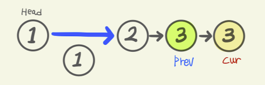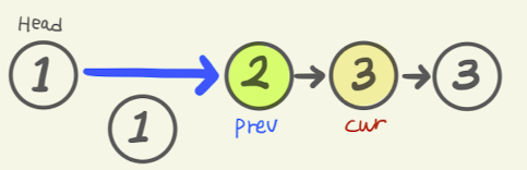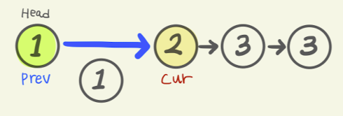 ListNode prev = head; ListNode cur = head.next; - 그러나 살펴보니, prev의 값 1과 cur의 값 1이 서로 같다. 위의 코드에서 반복문을 살펴보면, 서로 값이 같을 경우, 중복값을 제외하라고 나타나있다.만일 값이 같을경우, prev의 다음 참조 값은, cur의 다음 참조값을 참조하라고 나타나 있다. 이를 그림으로 옮겨보면 다음과 같다.
