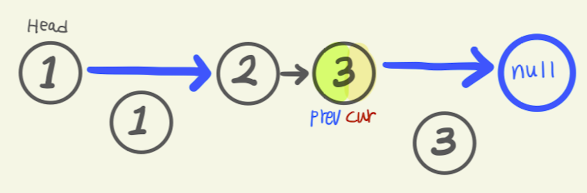 prev = cur; cur = cur.next; - prev의 값과, cur의 값은 서로 다르다. 그러니, 한 번 더 반복문이 실행되어 다음 값을 가리키게 된다.