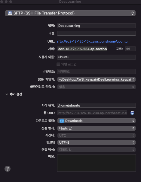 cyberduck프로그램으로 SFTP 설정하여 연결했다.
