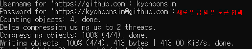 이제 새로 발급 받은 personal access token으로 git push를 할 수 있습니다. 확인해보니 잘 되네요.