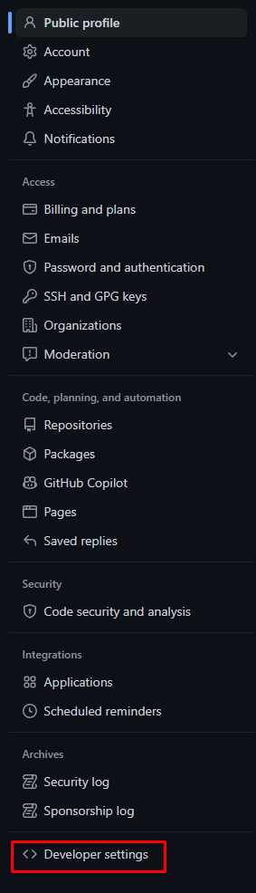 2. 왼쪽 메뉴 중에 [Developer settings]를 클릭합니다.