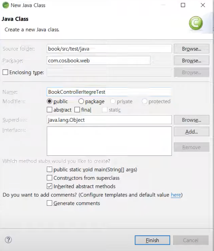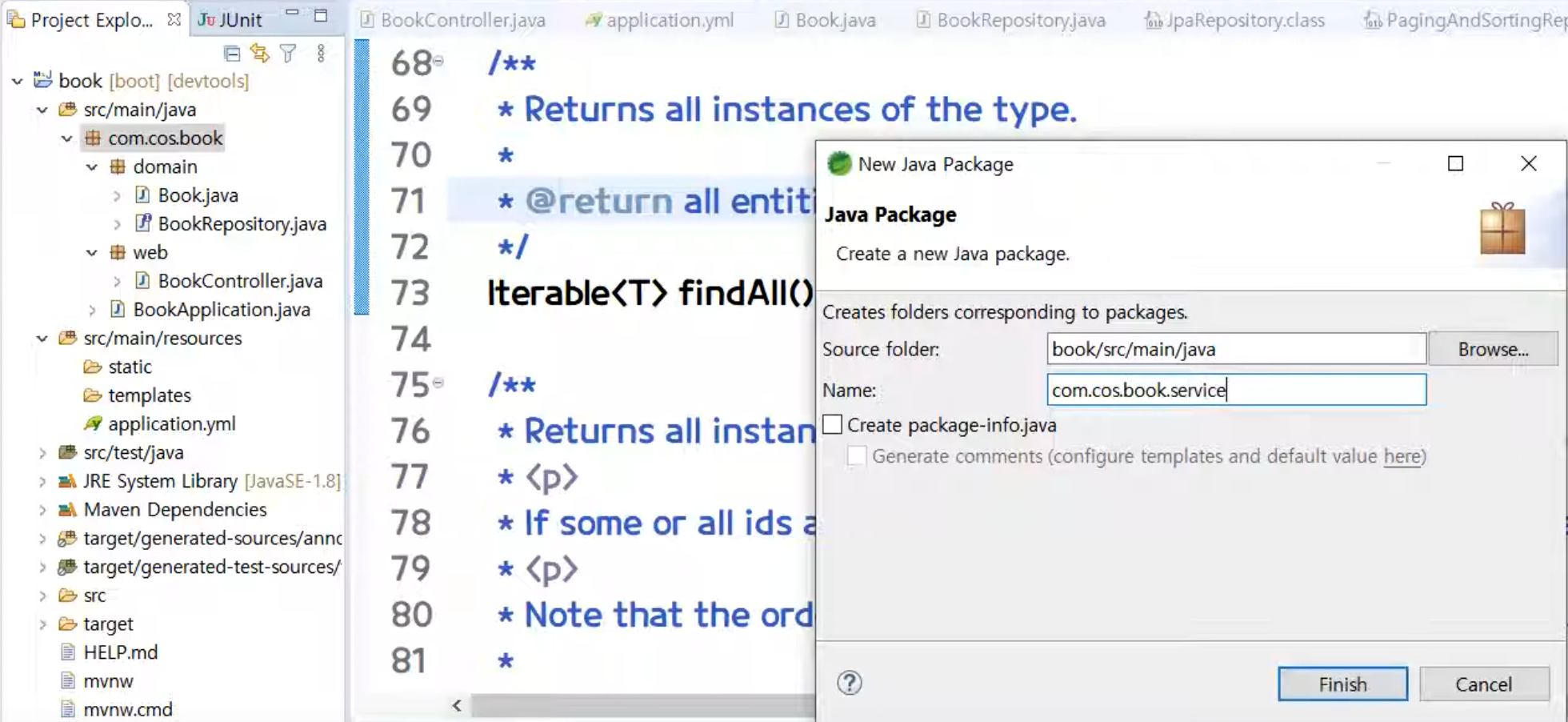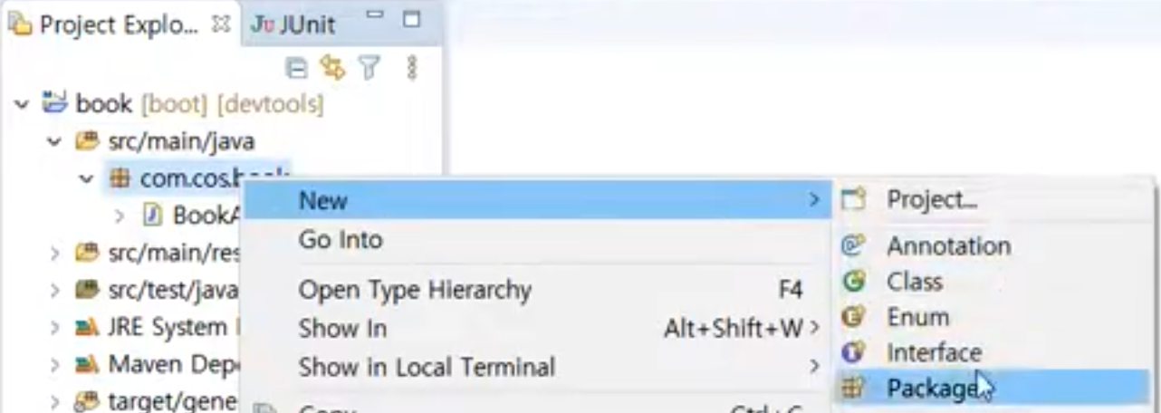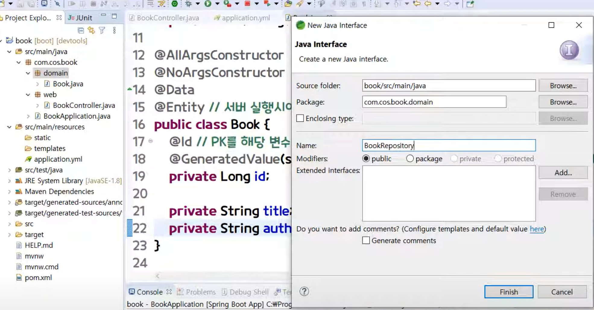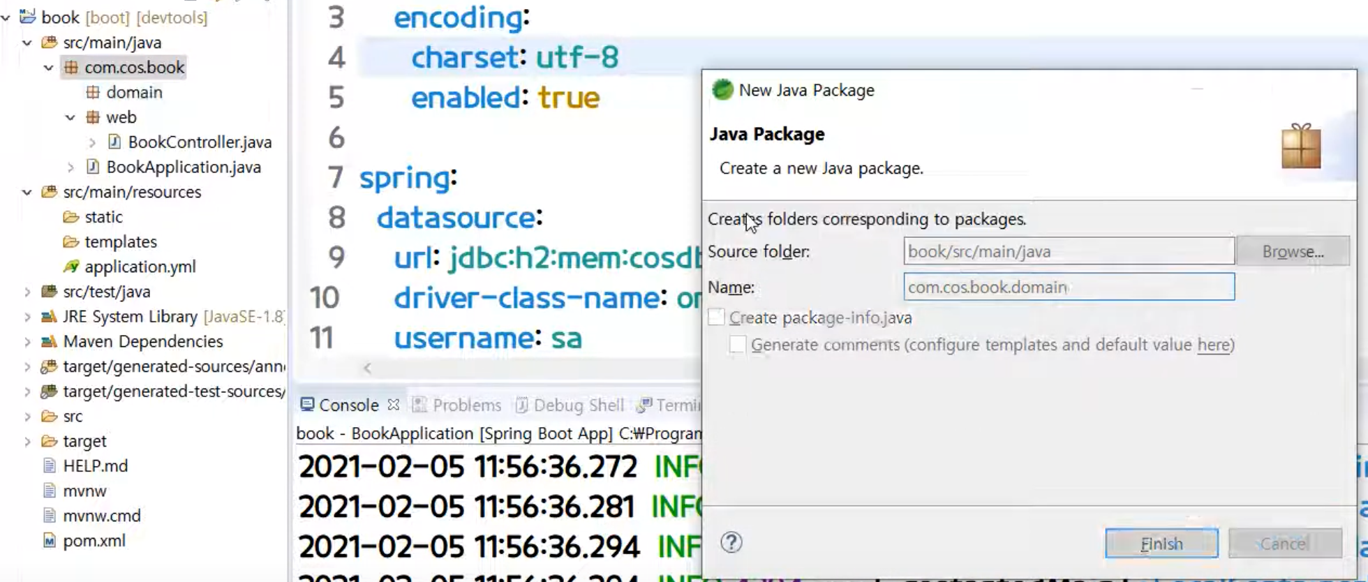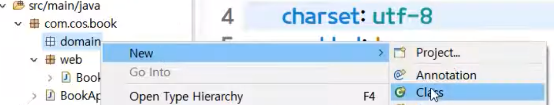 [ 패키지 우클릭] - [ name : com.cos.book.domain ] - [ finish ]