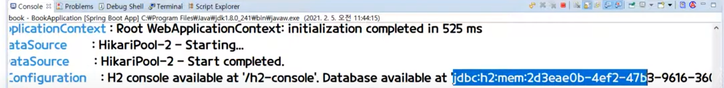 - JDBC URL : STS4에서 서버 실행 후 콘솔 창에서 URL 정보 드래그 복붙