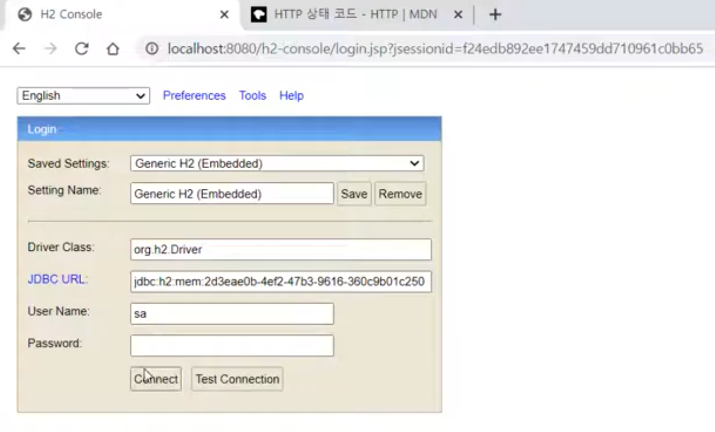 - User Name : sa (dafault 값)